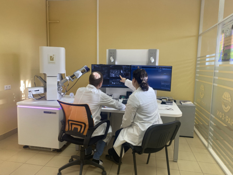 Cканирующий электронный микроскоп (СЭМ) с автоэмиссионным катодом Шоттки TESCAN MIRA LMS (4-ое поколение). СЭМ имеет диапазон увеличений от 2 до 1 000 000 крат и оборудован энергодисперсионным (EDX) спектрометром Ultim Max 65 c интегрированным программным обеспечением AZtecLive Automated (Oxford Instruments) с возможностью определения элементов от бериллия (4) до калифорния (98). Микроскоп также имеет детекторы вторичных электронов (SE), обратно-отражённых электронов (BSE) и катодолюминесценции (CL) с расширенным спектральным диапазоном (185-850 нм). Для напыления углеродного покрытия и нанесения металлических покрытий на образцыиспользуется автоматическая напылительная установка Q150R ES Plus (Quorum Technologies).